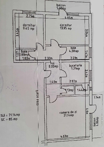Apartamentul se afla la etajul 1, cu suprafata construita de 85 mp (72 mp utili) si este format din: 2 dormitoare, 1 living, 2 bai, bucatarie, hol spatios, 2 balcoane, 2 debarale pentru depozitare.